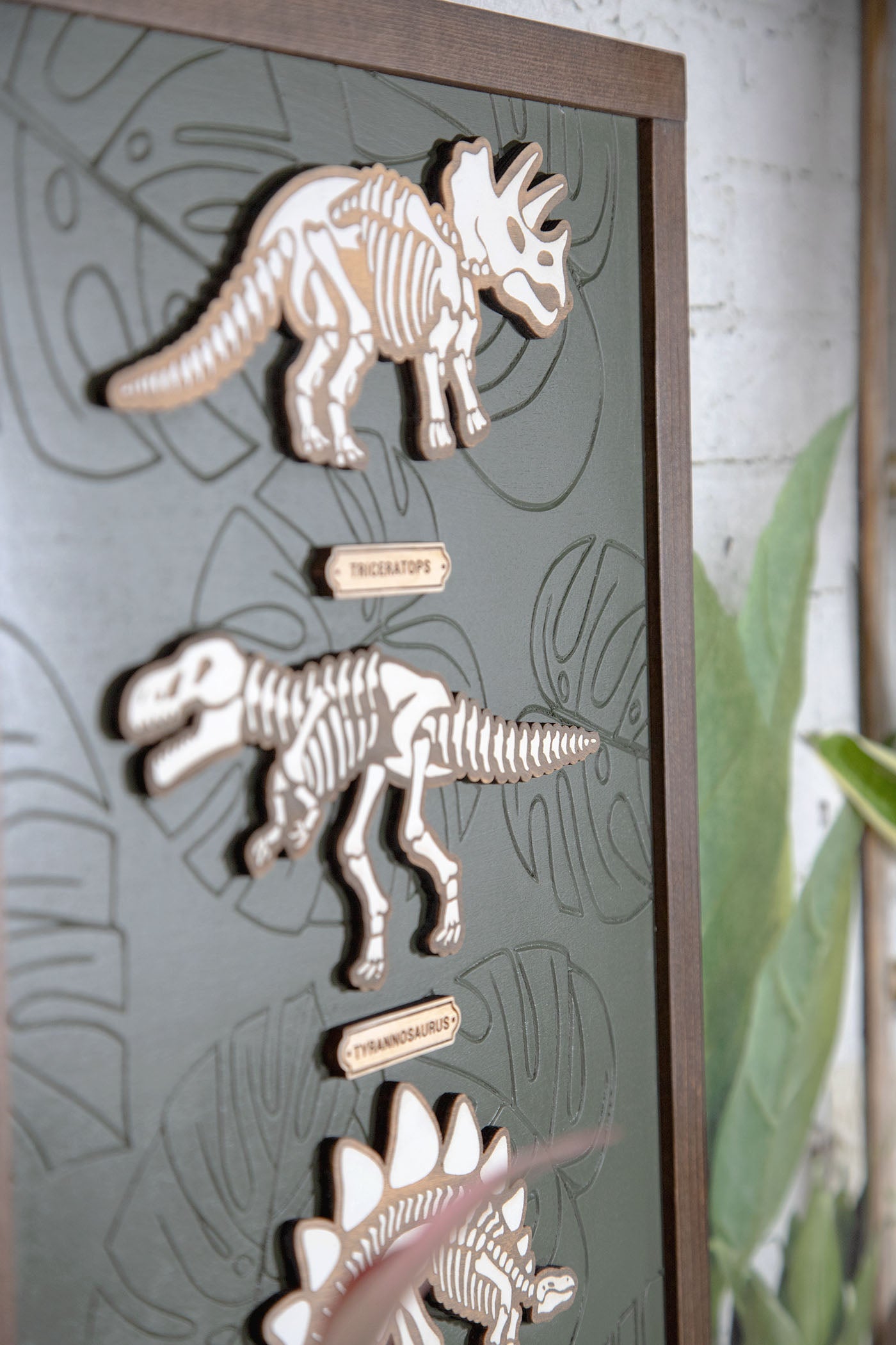 Dino Skeleton Engraved Monstera Wood Sign 12x24