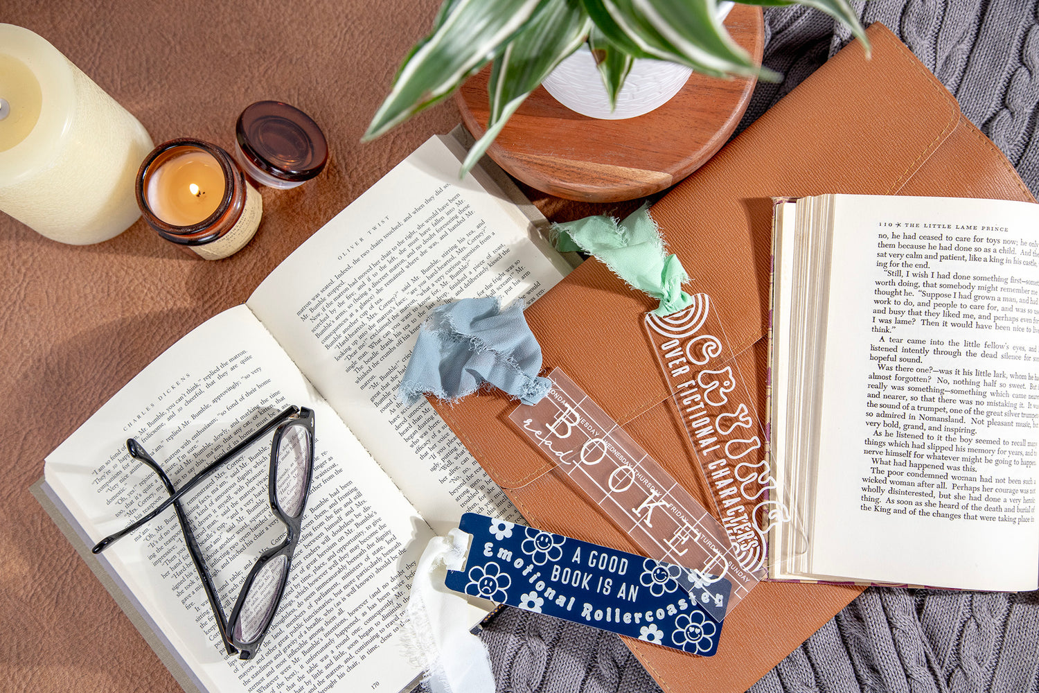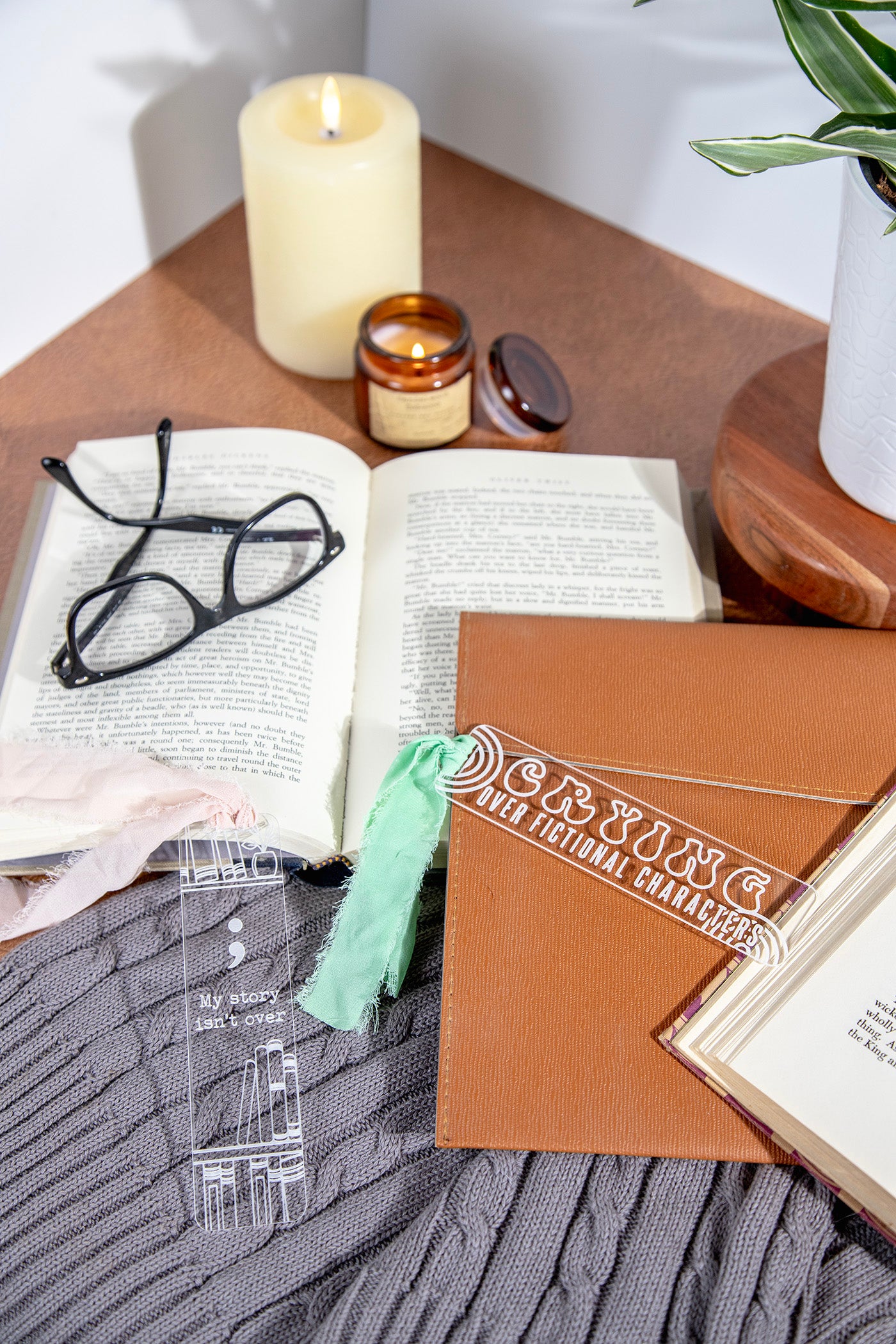 Our acrylic bookmarks are designed and crafted in house. Nothing is better then unwinding & cozying up with a good book but for when reading cover to cover in one sitting isn't possible these bookmarks come in handy. They make perfect gifts for any avid reader in your life or as a little treat for yourself.